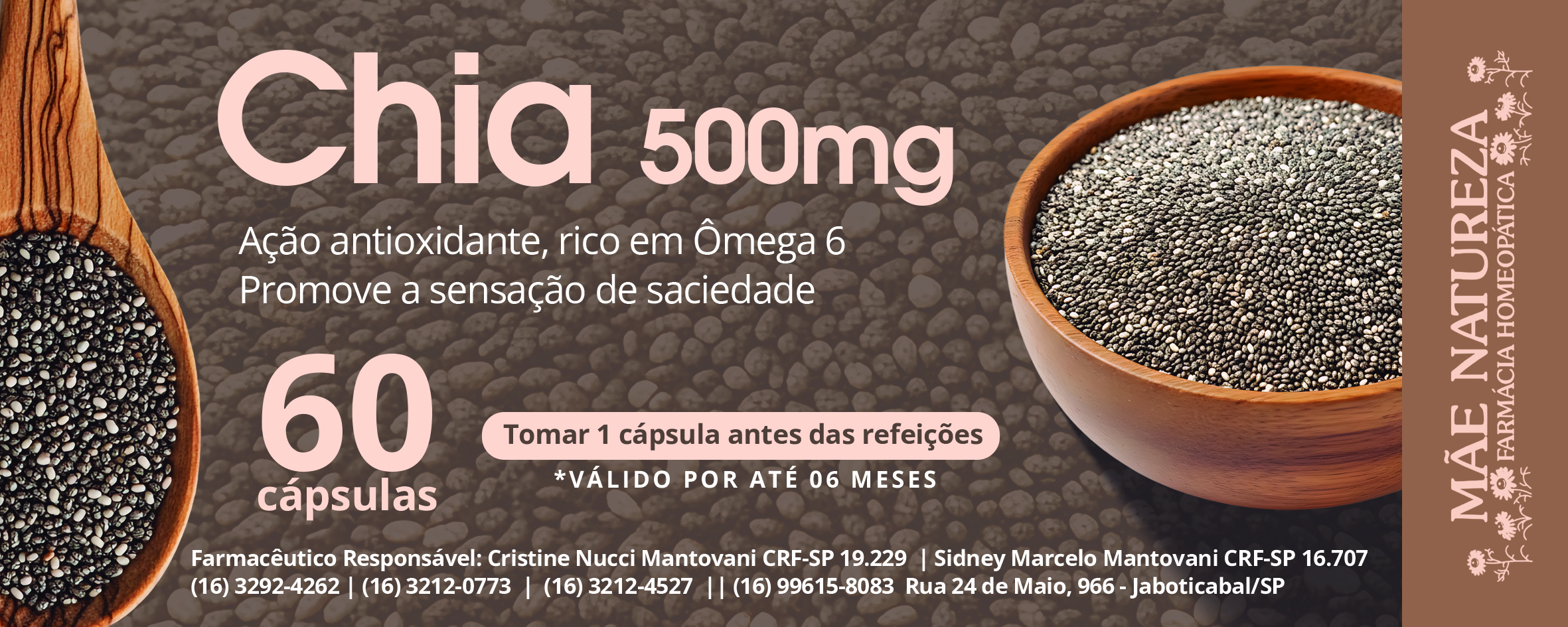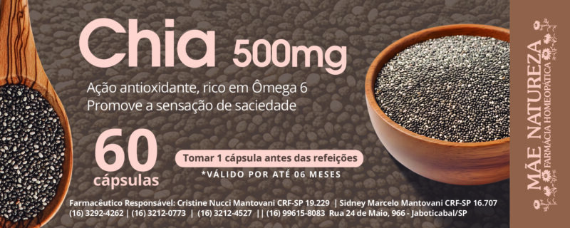 - Atenção: A ingestão elevada de chia pode diminuir a pressão arterial em idosos. Não utilizar em pacientes com uso de anticoagulantes, grávidas e lactantes.