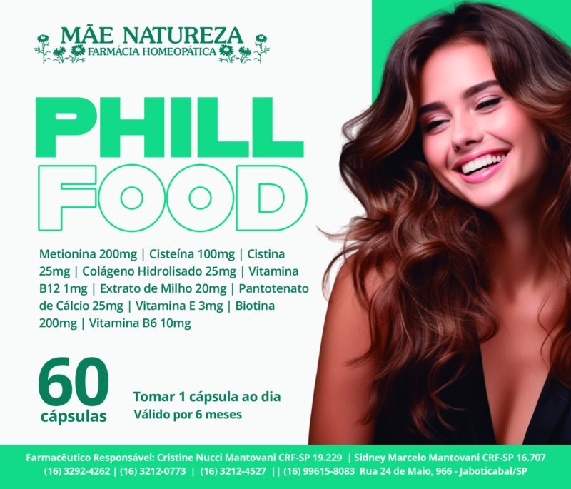 O Phill Food é um complexo vitamínico e mineral desenvolvido especificamente para o fortalecimento de cabelos e unhas, além de auxiliar na melhora do aspecto da pele.